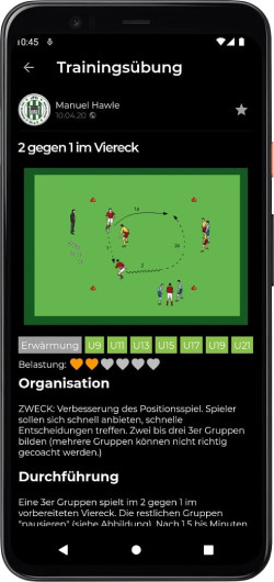 Dieser Bereich ist nur für Trainer. In der App steht eine große Bibliothek an Trainingsübungen zur Verfügung. So hast du immer Zugriff auf Übungen mit detaillierten Coachingpunkten. Trainingsübungen können nach Schlagworten gesucht und als Favoriten markiert werden.
