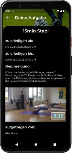 Für Spieler werden alle zu erledigenden Aufgaben nach Zeit der Fälligkeit aufgelistet. Ein Tipp auf die Aufgabe öffnet die Detailansicht. Hast du die Aufgabe erledigt, kannst du die Erledigung zurückmelden. Hierfür gibt es auch noch ein Mitteilungsfeld und die Möglichkeit "Beweis-"-fotos oder -videos hochzuladen. Dein Trainer hat so noch mehr Informationen, wie die die Aufgabe gelöst hast.