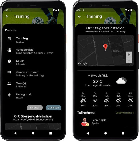 Durch Antippen der Veranstaltung gelangst du zur Detailansicht. Neben den Stammdaten (Ort, Datum, Team) kannst du hier zu- oder absagen. Deine Rückmeldung ist in Echtzeit beim Trainer und den den anderen Teammitgliedern zu sehen.
