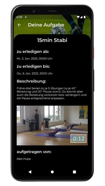 Alle Aufgaben, die du erledigen musst, hast du übersichtlich auf dem Smartphone.Du kannst dir Aufgaben im Detail ansehen, die Videos der Aufgabe direkt anschauen und wenn du Aufgabe erfüllt hast, dem Trainerteam mit Bild oder Video eine Antwort senden.
