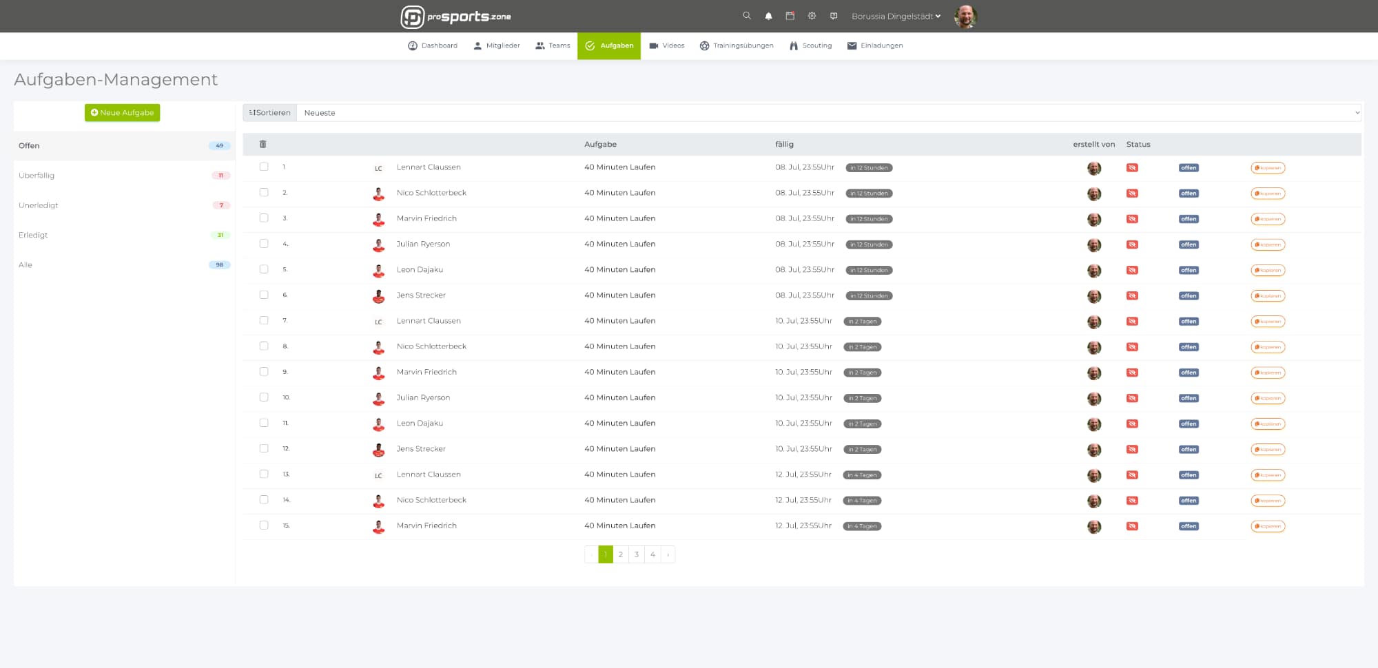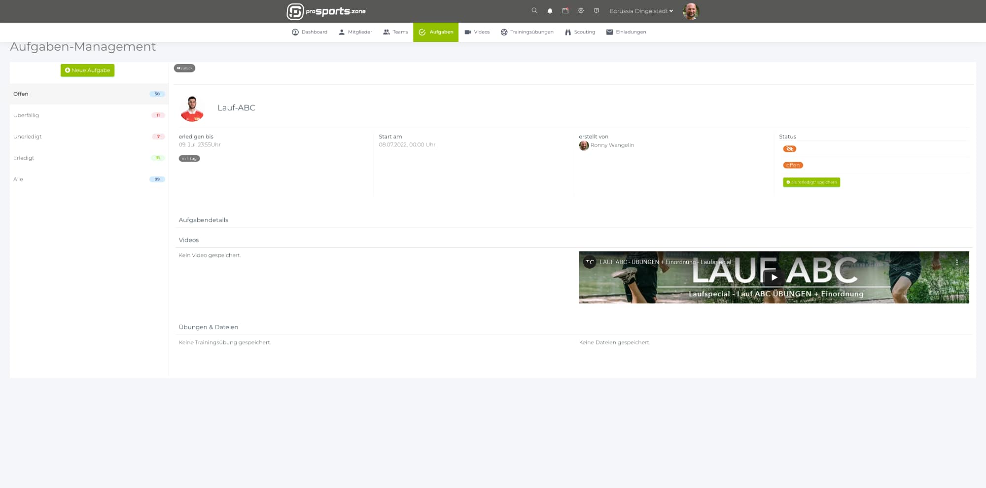 Der Aufgaben-Manager vereint alle Funktionen, die bestens die Anforderungen von Nachwuchsleistungszentren oder Fussballschulen erfüllen. Trainingsübungen, Videos oder anderen Dokumenten können einfach mit den Aufgaben verknüft werden. Spieler können die Aufgaben zu kommentieren und sie per Video und Bild als erledigt markieren. Auf Trainerseite bieten die einfachen Planer-Funktionen und die übersichtlichen Dashboards einen echten Mehrwert in der Ausbildung.
