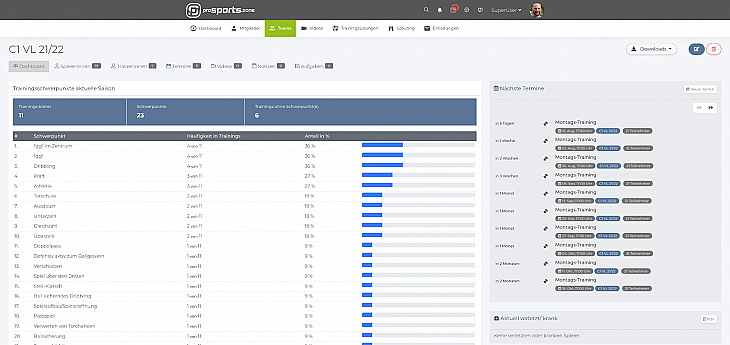Keeping an overview of the training content and focus areas covered in your team’s sessions is now easier than ever with proSports.Zone. For each team, you get a summary of: