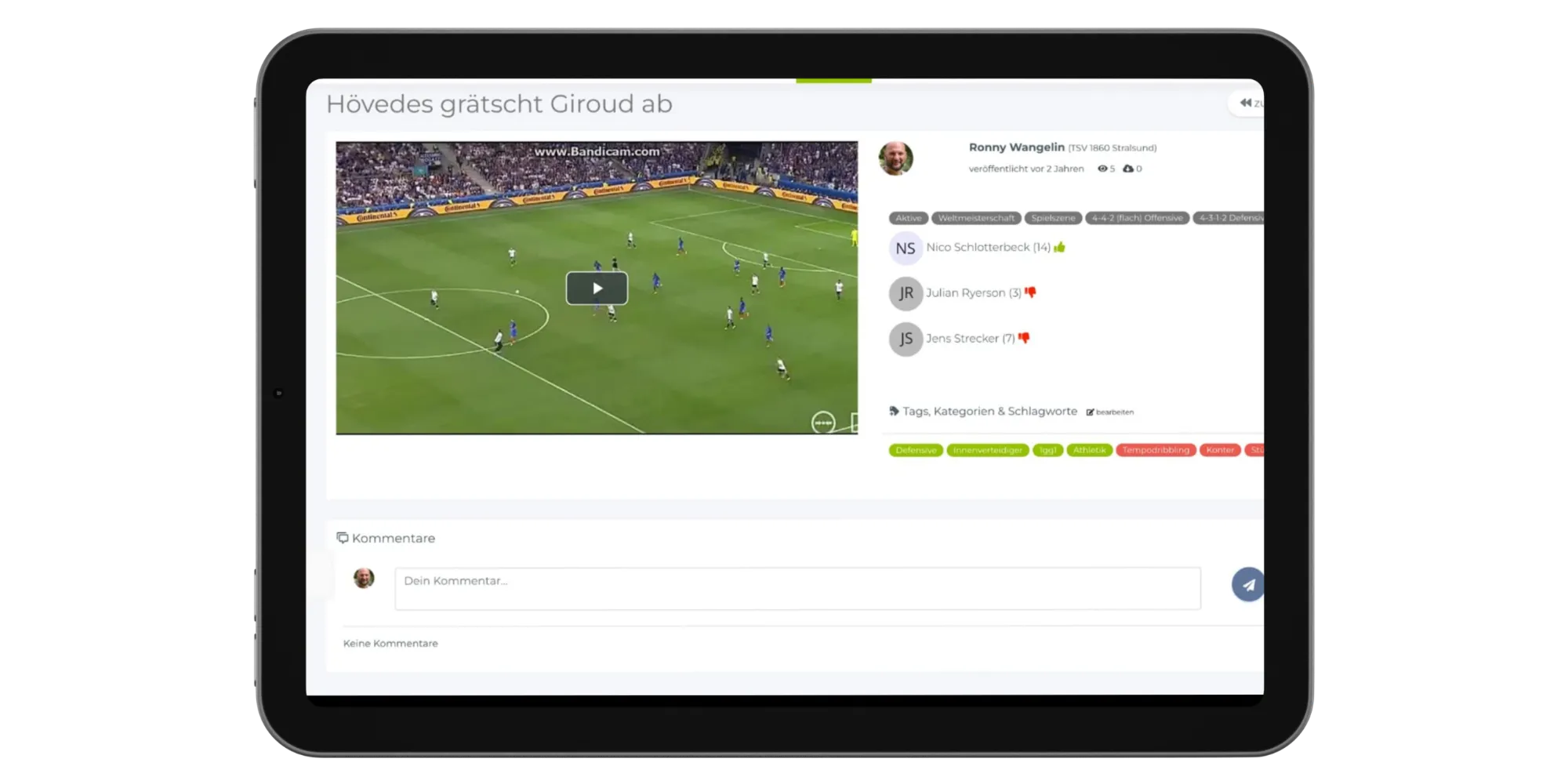 Videos can also be linked to tasks, serving as training guides or for individual video analysis for players.